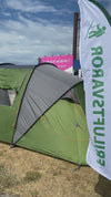 Royal Tunneltält Deluxe 6–8 personer uppställt med öppna dörrar, i färgen Forest Green och Concrete